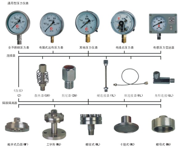 為了擴大各種通用型壓力儀表的使用范圍,能適用于測量強腐蝕、高溫、高粘度、易結晶、易凝固和有固體浮游物介質的壓力,以及對某些測量介質不能直接進入通用型儀表內和便于清洗防止沉淀物持積聚的場合的壓力檢測時,須采用由隔膜隔離器與通用型壓力儀表組成一個系統的隔膜表。